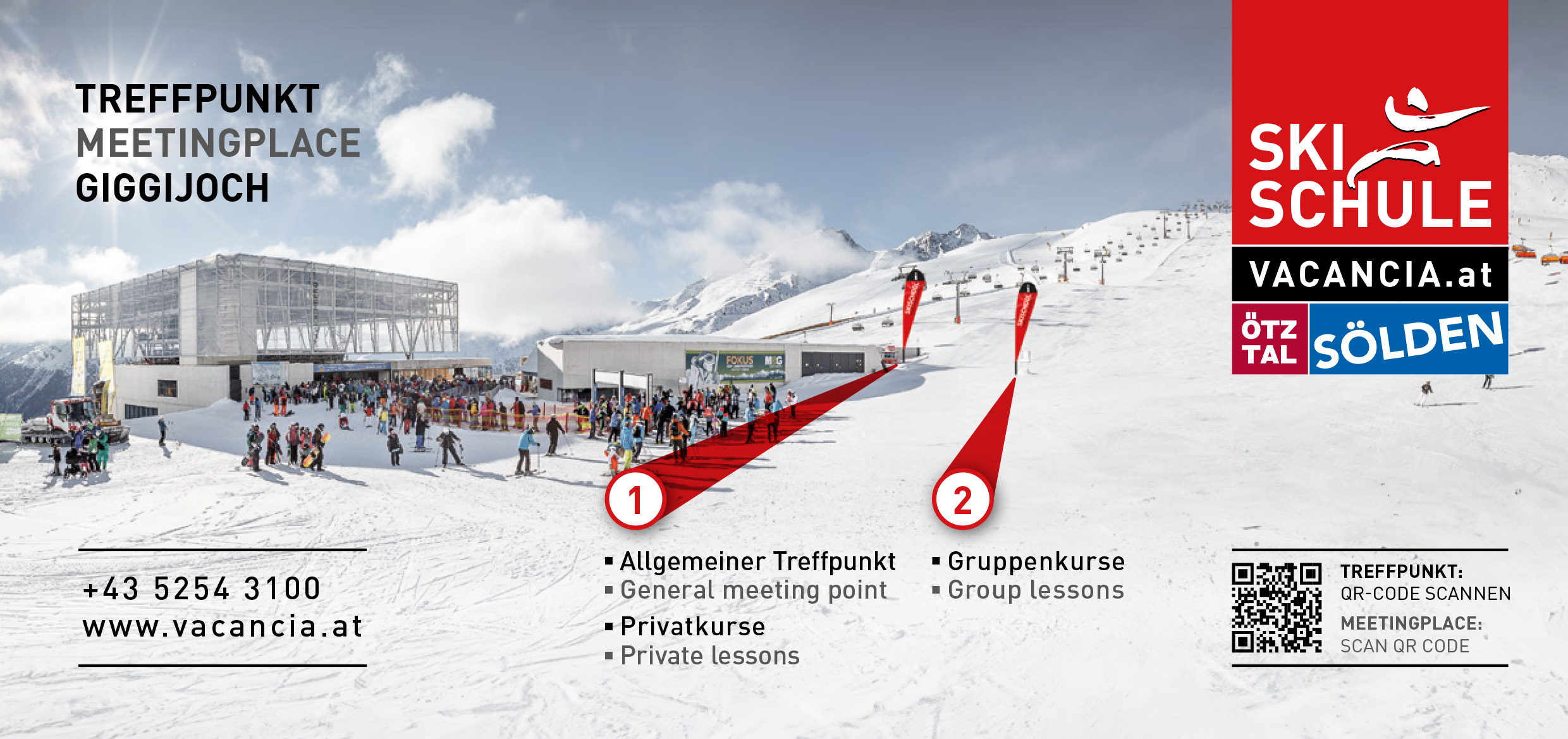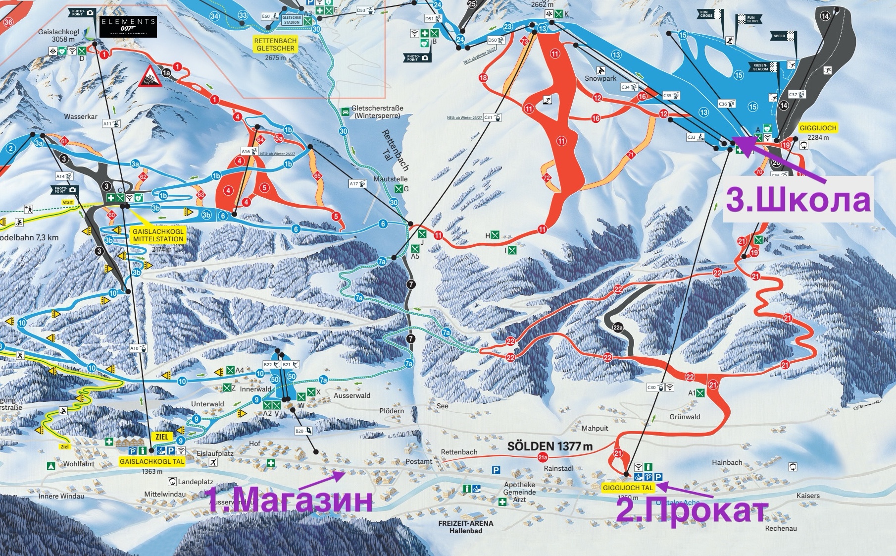 3. На верхней станции кабинки Giggijoch находится место встречи всех школ Зёльдена. В основном именно здесь начинается и заканчивается занятие с инструктором. В исключительных случаях, можно договорится о встречи с инструктором в другом месте, но только если это не нарушит работу инструктора в течении дня.
